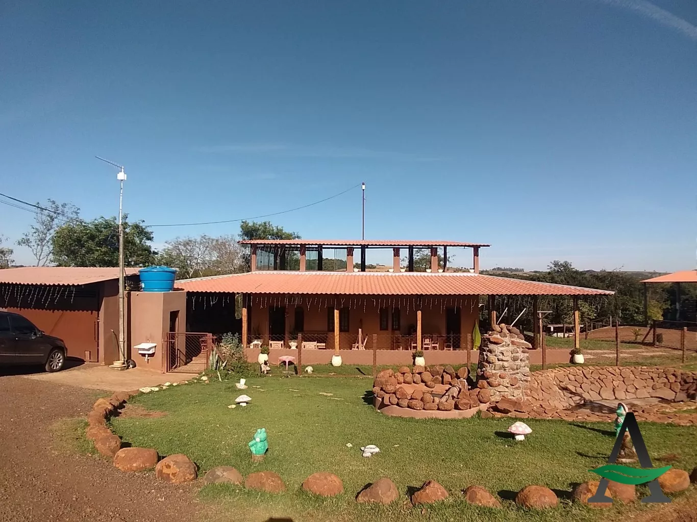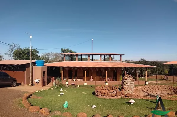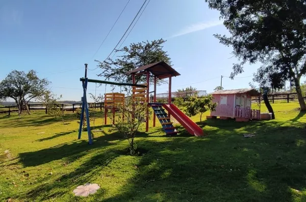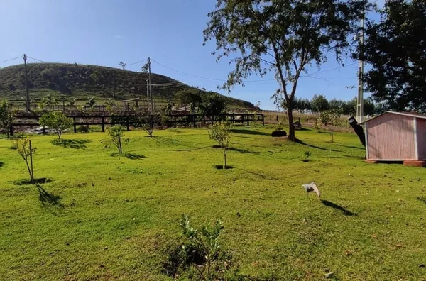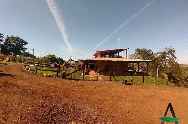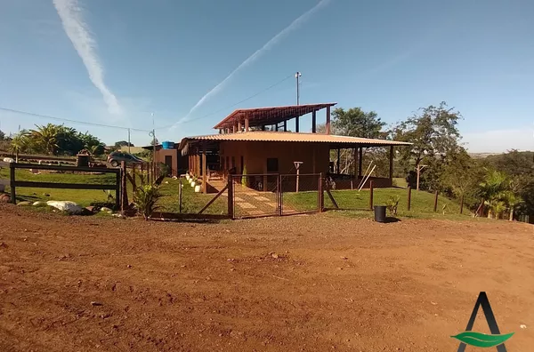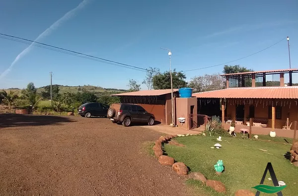 Chácara contém uma casa de dois andares (conforme descrição) com salão de festas.